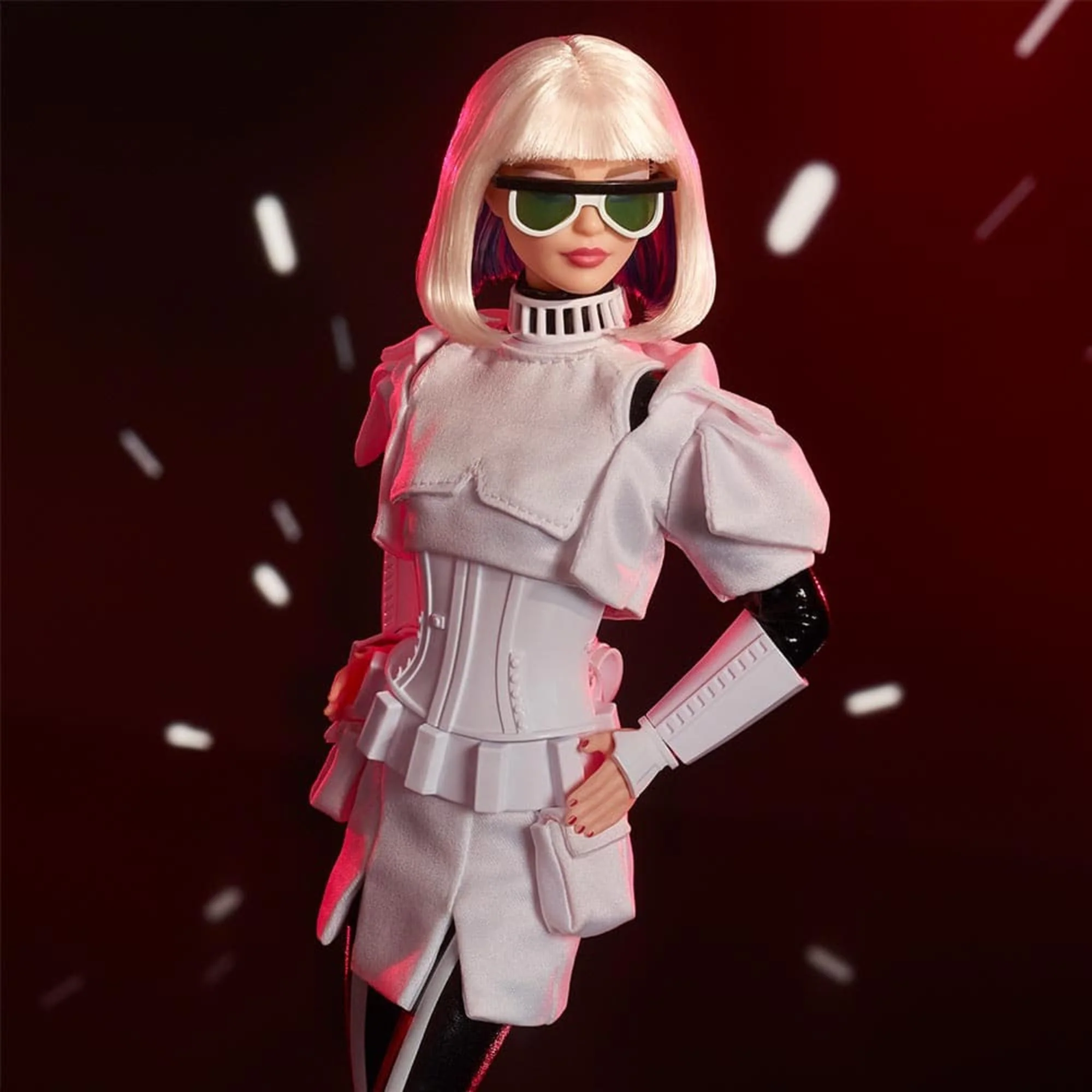 The Star Wars™ x Barbie® collection, inspired by the films’ original concept art, re-imagines iconic Star Wars characters through a distinctive Barbie™ high-fashion filter. Stormtroopers’ imposing white armor, blaster rifles and great skill make them a force to be reckoned with, and their fanatic loyalty to the Empire renders them steadfast -- and lethal -- in their fight for the Imperial cause. This collectible Star Wars x Barbie® doll takes design inspiration from the troops’ legendary look to capture their plastoid armor in a runway-ready silhouette. Star Wars Stormtrooper x Barbie® doll is striking in head-to-toe white over a black bodysuit with a shiny patent-leather look. A platinum bob, dark glasses, cuffs, a utility belt and boots with a knee protector plate detail complete the battle armor-inspired look. Star Wars Stormtrooper x Barbie® doll makes the perfect addition to any collection and a great gift for Star Wars and Barbie® fans. Includes a Star Wars doll stand and Certificate of Authenticity. Doll cannot stand alone. Colors and decorations may vary.